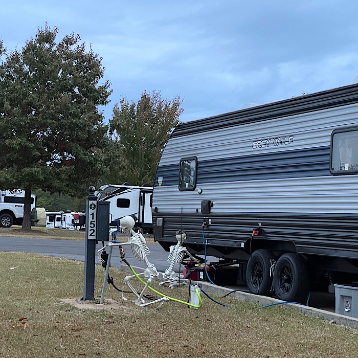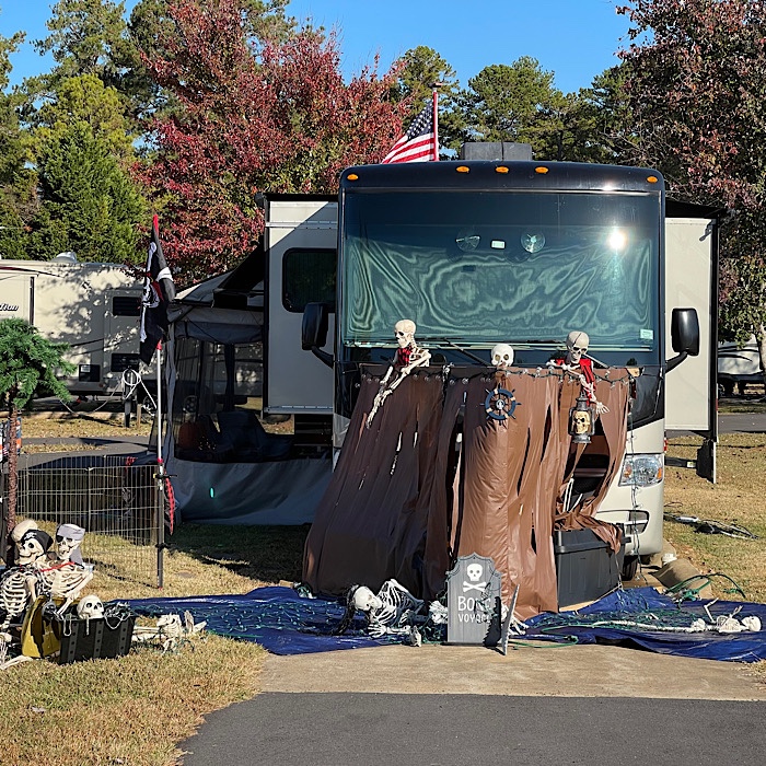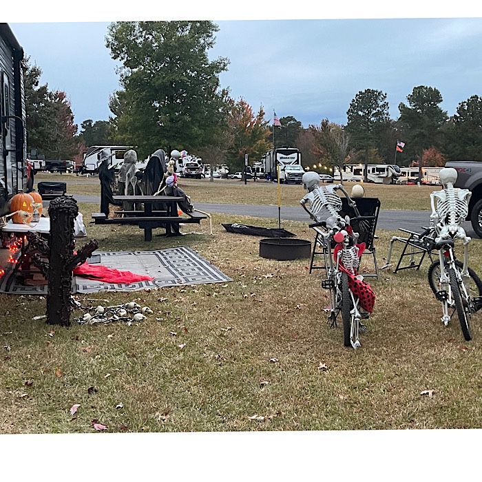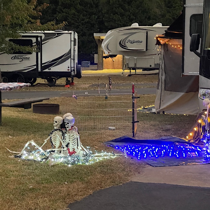 Very few decorations here; my simple pumpkin face on the windshield, my friend has flashing purple mini lights, the campground hosts have a few things out, and one camper has simple fabric ghosts in the trees. But what a lot of skeletons you have – I like the ones who look like they are setting up the site.