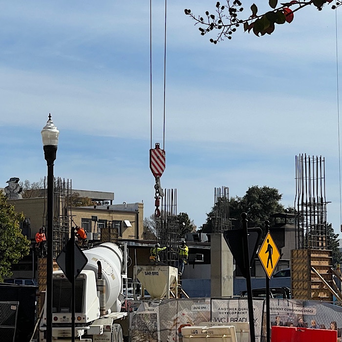 There was construction going on. We stopped to watch concrete being poured from a concrete truck into a container being lifted by a crane. The container was moved to a column and the concrete was poured from the container.