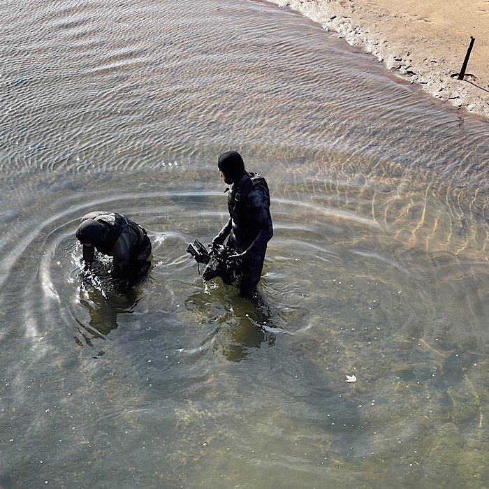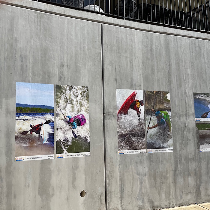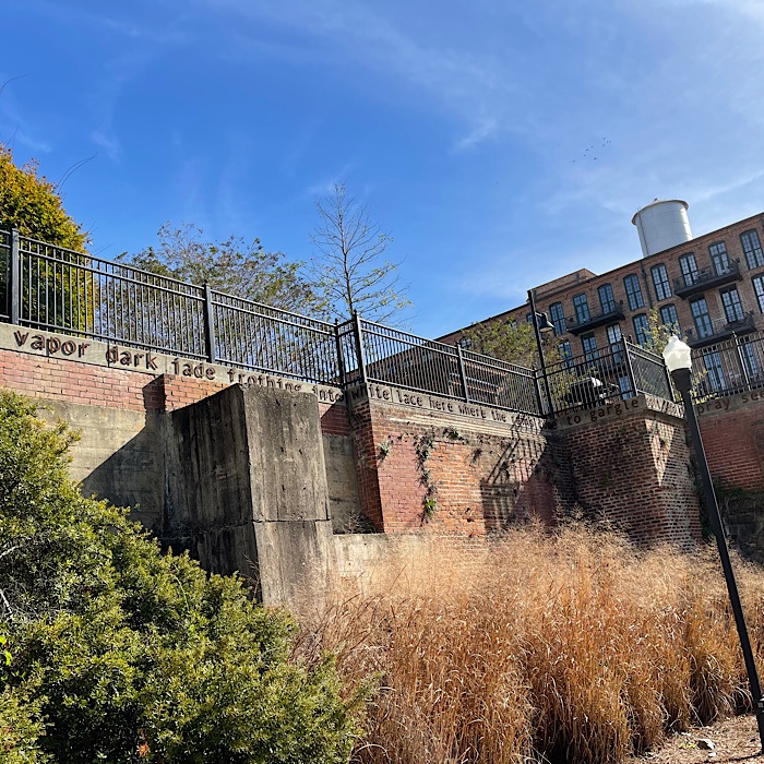 We walked past the old powerhouse. There was a poem written with iron letters along the edge of the powerhouse. We walked across a bridge to see the more of the powerhouse. We could see the chute for kayaking. There was a great blue heron.