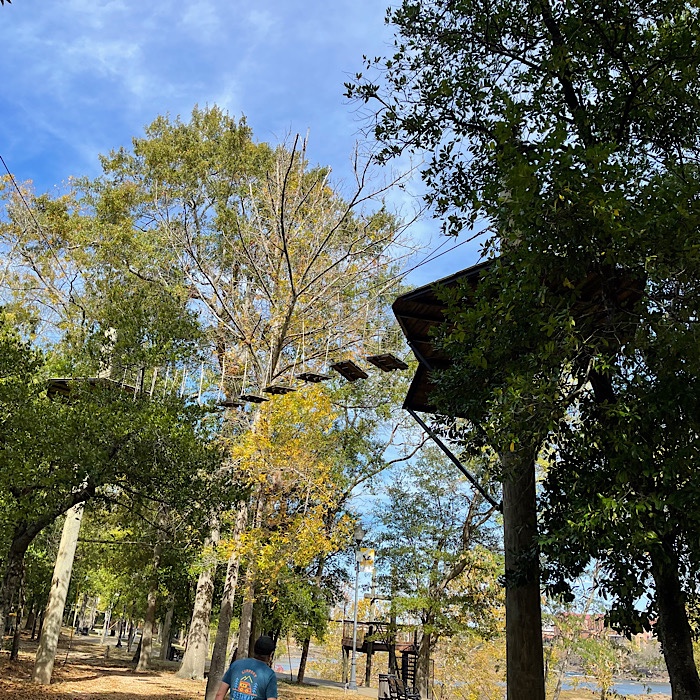 We crossed the brick bridge and continued along the Riverwalk. There was a zip line course.