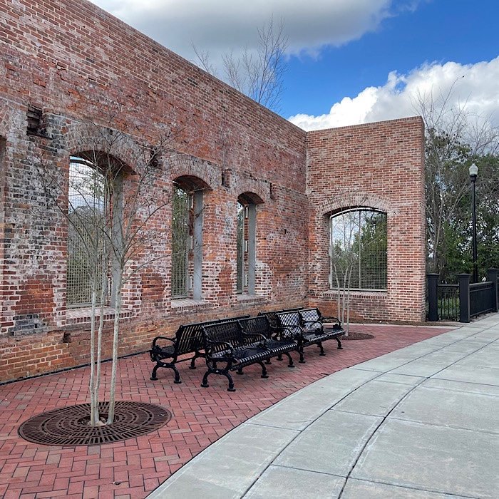 At the north end of the bridge, there is the remains of a brick mill with an brick folly for the Riverwalk.
