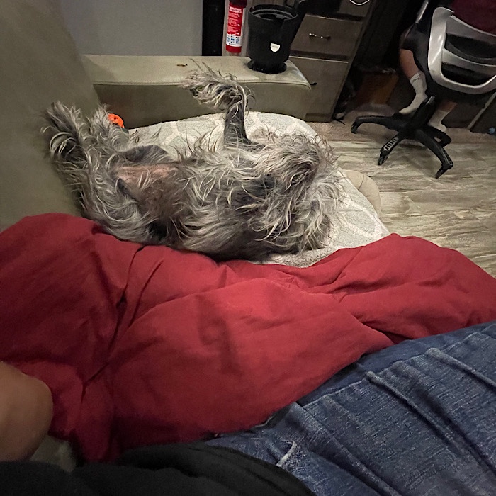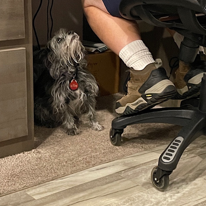 Later, Nox decided she wanted to sit next to Bruce. She walked underneath his desk and sat there, looking up at him for a while. I am not sure what thoughts Nox was trying to put in Bruce’s head.