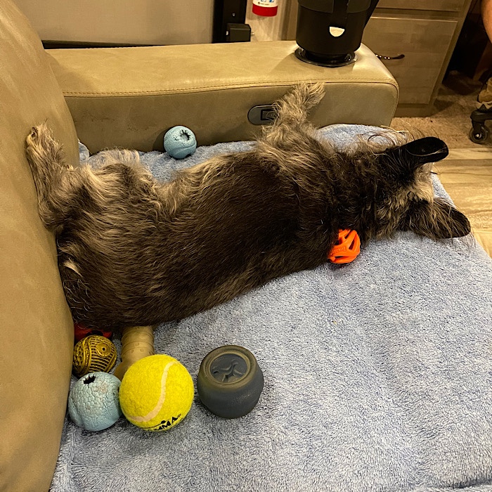That she does! Today she only has one toy with her. The others are scattered around the RV.