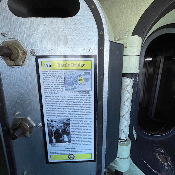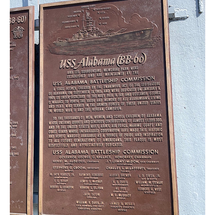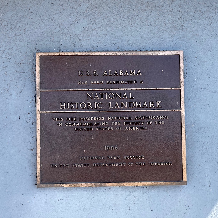 We walked up the first ramp (there are two ramps). On the side of the ship, were plaques with information about the USS Alabama.