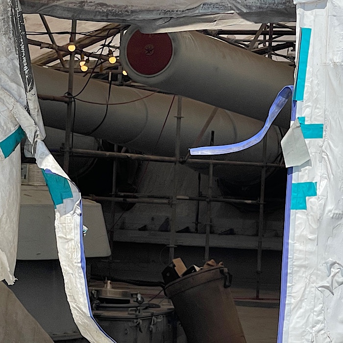 The park is doing maintenance on the aft 16”/45 caliber guns. They were covered with white tenting.