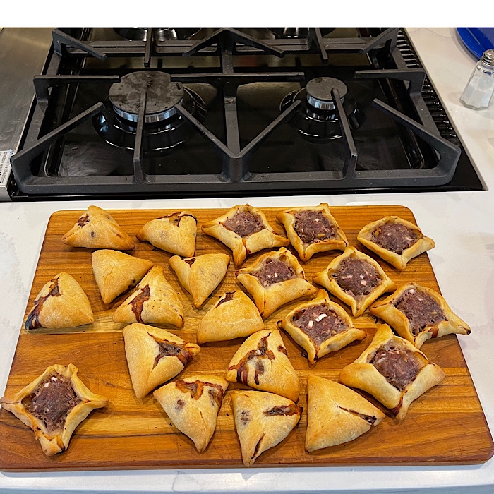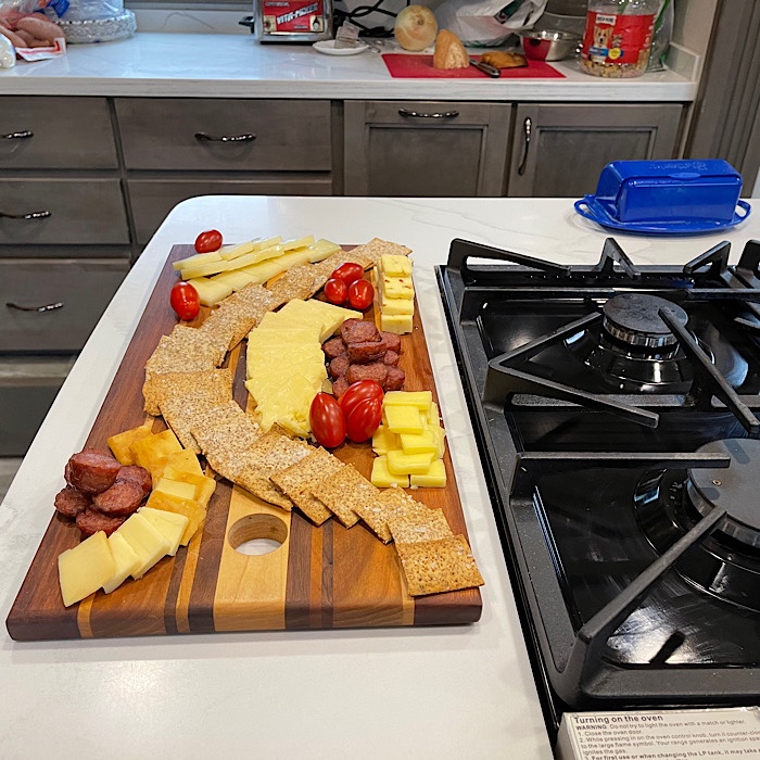 I made meat pies, cucumber dip and crackers. I also cooked some rounds of smoked German sausage. I put together a charcuterie board of cheese, crackers and the rounds of the German smoked sausage.