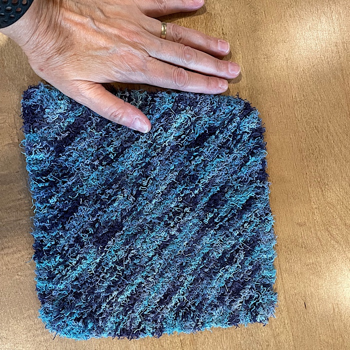Scrubby Washcloth with my Hand to Show Size