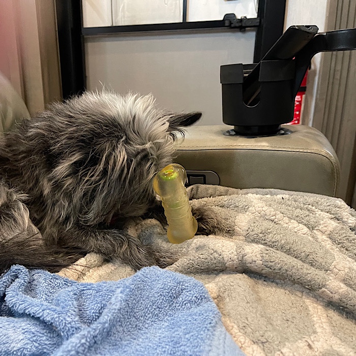 I just wanted to share these pictures of Nox working hard to get a treat out of her bone toy.