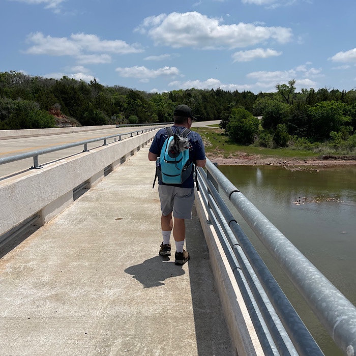 Nox started out ready to walk and got tired part way over the bridge. She had to be put in her backpack.