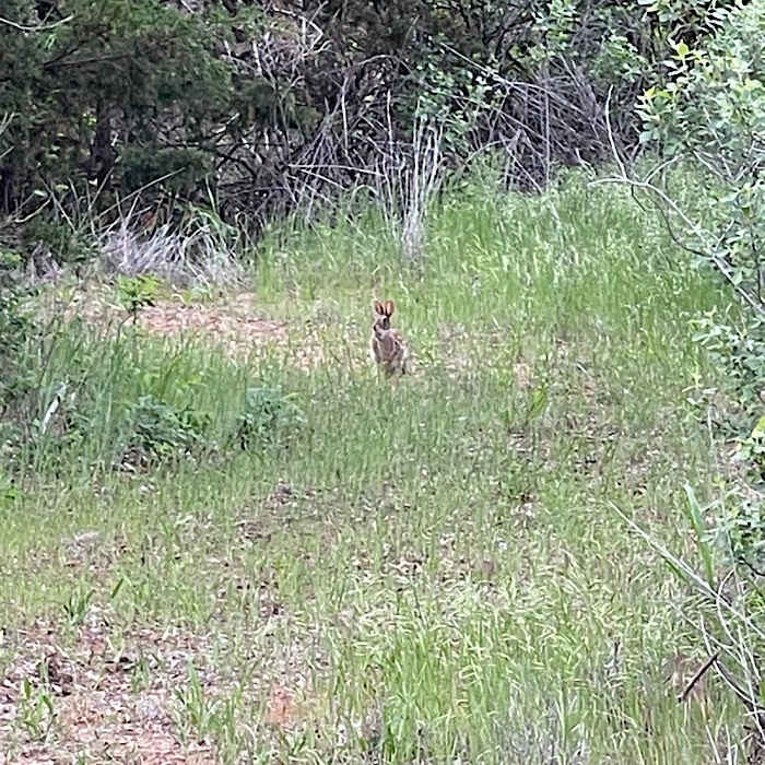 Tall shrubs and bushy evergreens lined the path. After we got really tired of not finding the campground, we retraced our steps and turned left. We saw a rabbit on our way out.