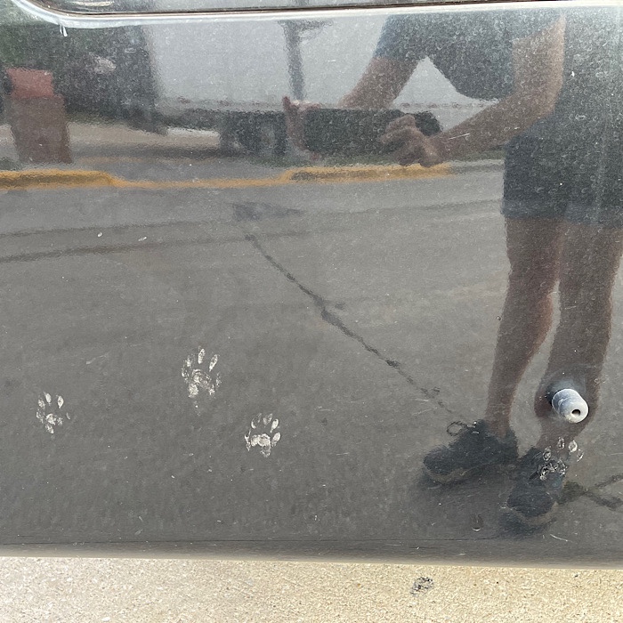 I took Nox out for a walk and noticed these footprints on the RV. (The photo was taken later at a rest stop.) I did wonder if this animal is what caused her to become so agitated.