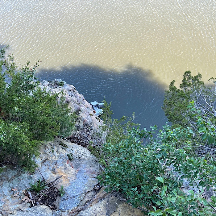 We heard voices and we looked over the edge of the platform. We could see part of a boat sticking out from underneath the bluff.