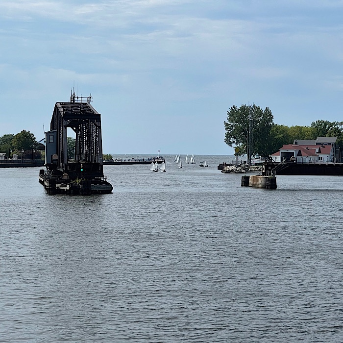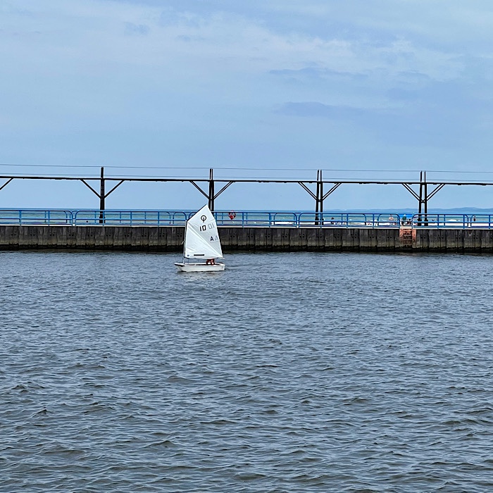 We walked out along the pier. There were sailboats on both sides of the pier, small one-man sailboats in the St. Joseph River and slightly larger sailboats in Lake Michigan. As we watched, we realized the small sailboats were trying to catch up to the larger boats.