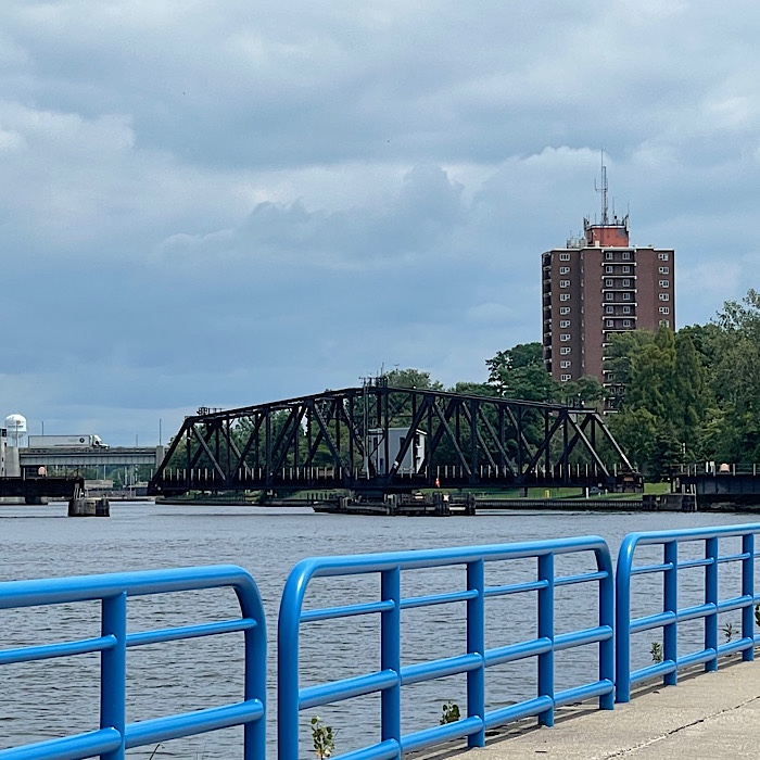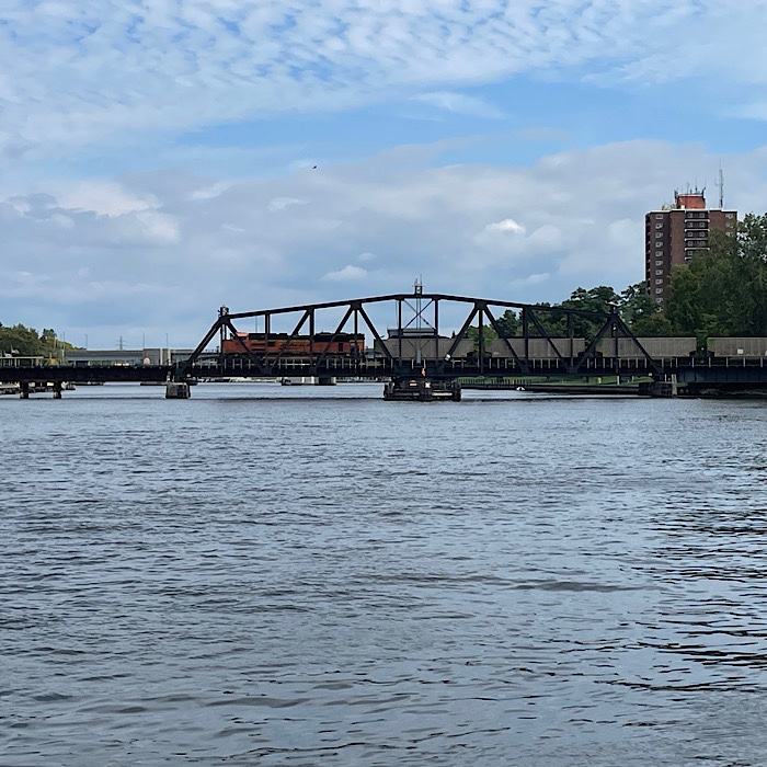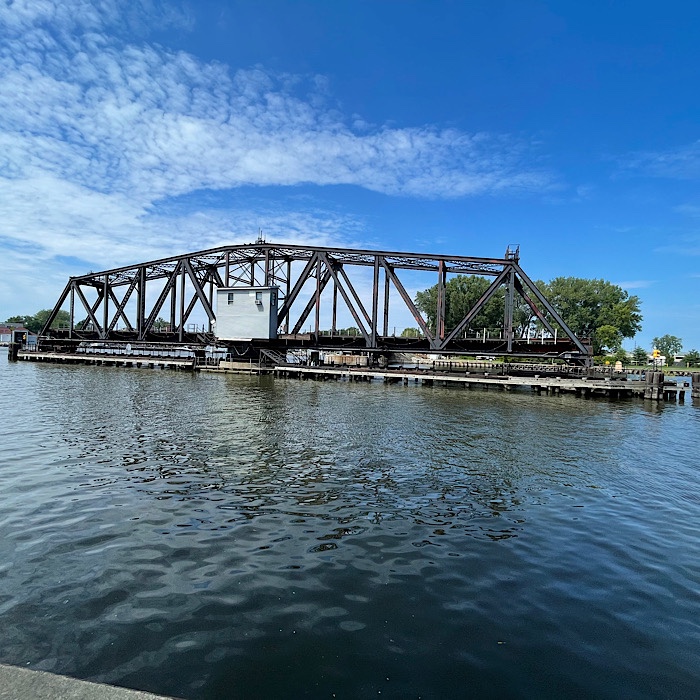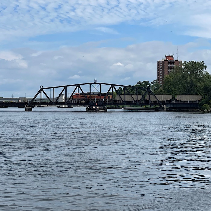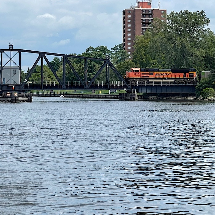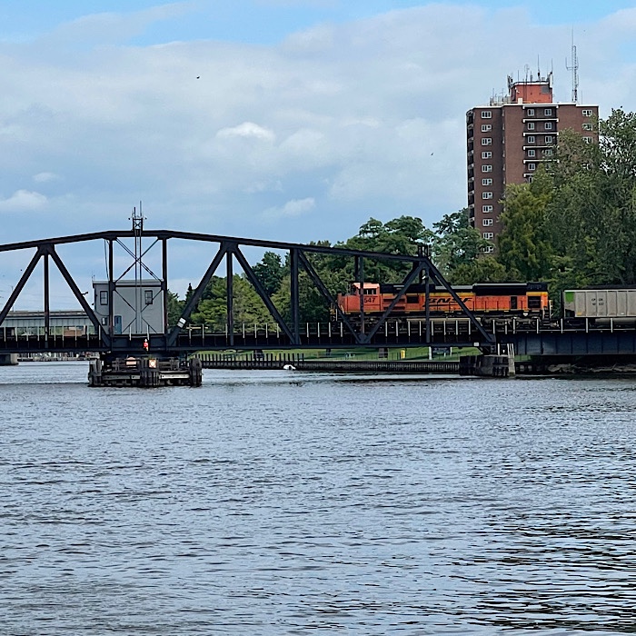 As we were walking back to the shore along the pier, the green light on the rail swing bridge turned red, along with a loud warning horn sounding. The swing bridge started swinging closed. After several minutes, the thunder of a train engine and a whistle could be heard.