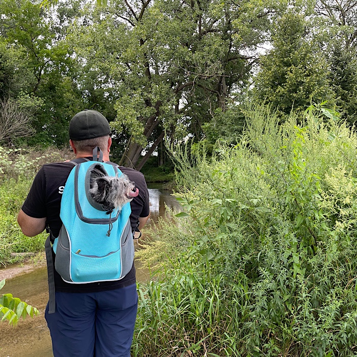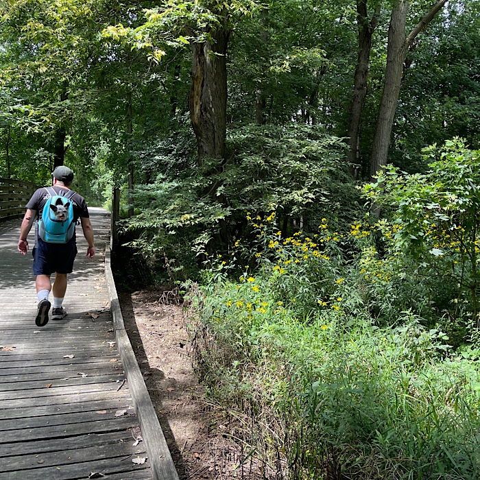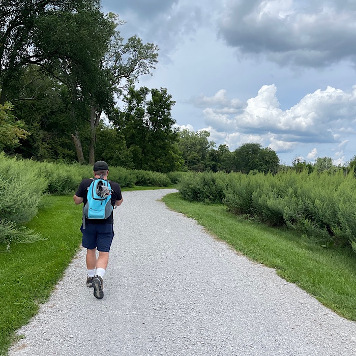 On August 13th (Sunday), we started out our walk with Nox on the leash. She got tired before we made it out of the fairgrounds, so she was placed in her backpack and put on Bruce’s back.