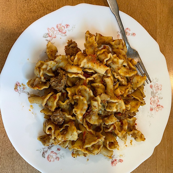 This recipe is a modification of the Pasta with Italian Sausage, Tomatoes and Eggplant from Milk Street: Tuesday Nights Mediterranean by Christopher Kimball.