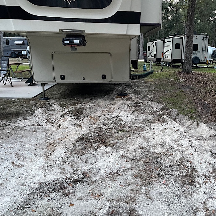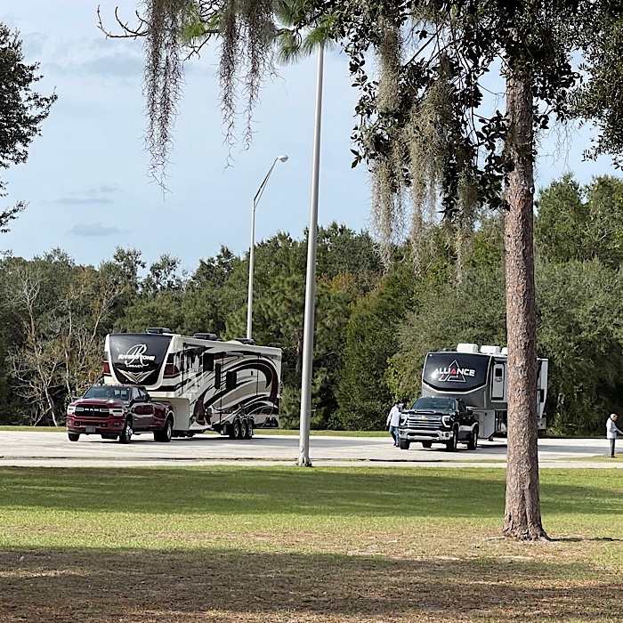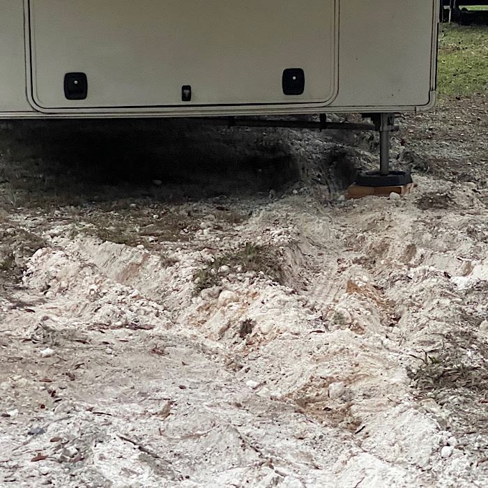 When we got to Trails End RV Park near Floral City, FL, we found we had been given a back-in site. While not ideal (we prefer pull-throughs), we thought it wouldn’t be to hard to get into the site.