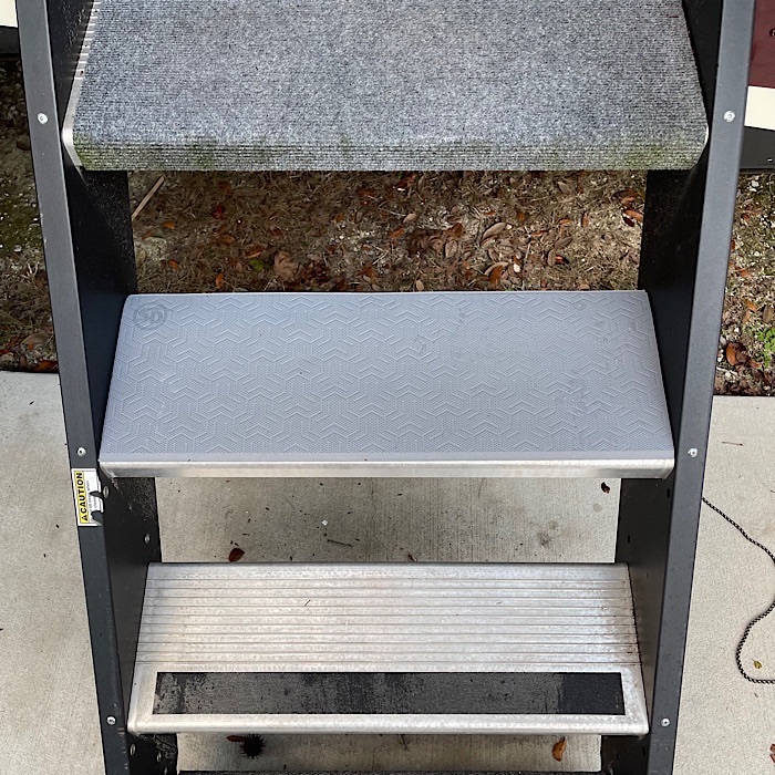 The SeaDek RV Step Cover has some cushioning to it. Bruce also said it was easy to install. He did have to cut a little from the side, as our steps weren’t as wide as the cover. I got the impression the hardest part of the job was cleaning all the dirt from the step.
