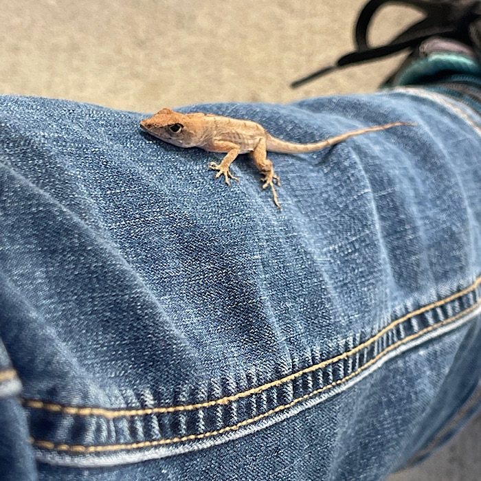 The anole stayed on my leg for nine minutes. I had enough time to text Bruce, āI have a lizard on my leg.ā Bruce came out and took some pictures. He was very amused by the anole being so still on my leg.