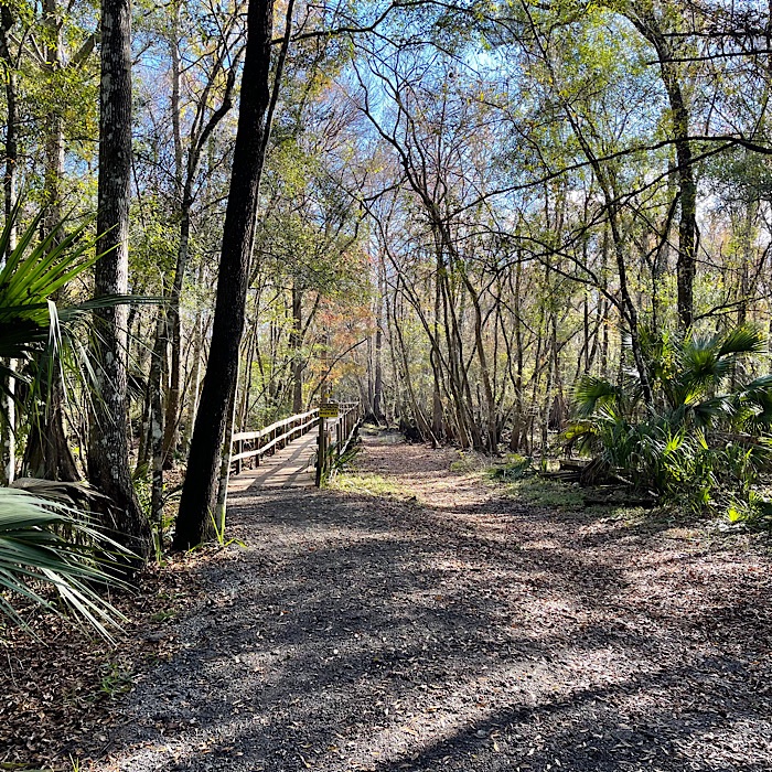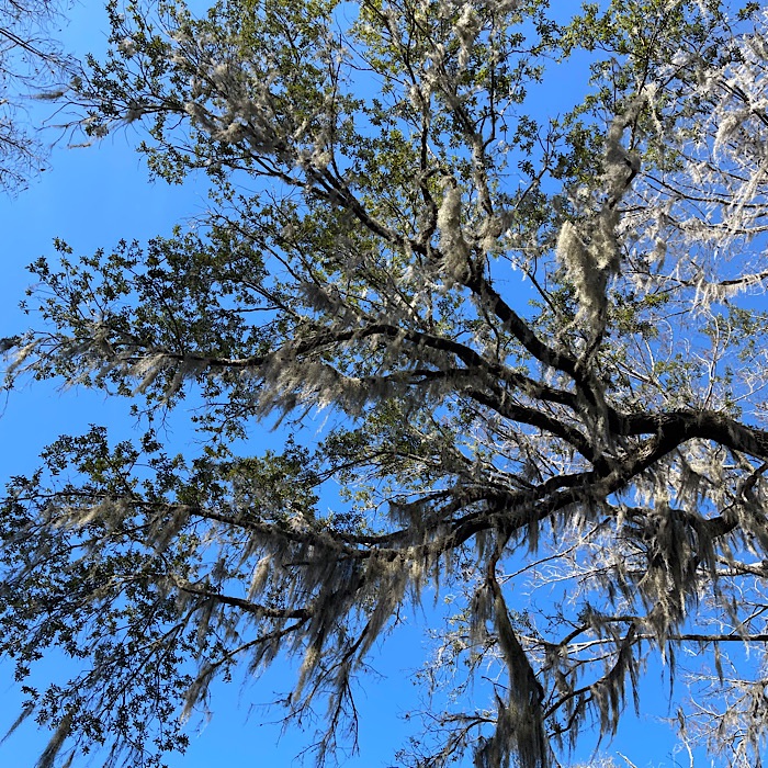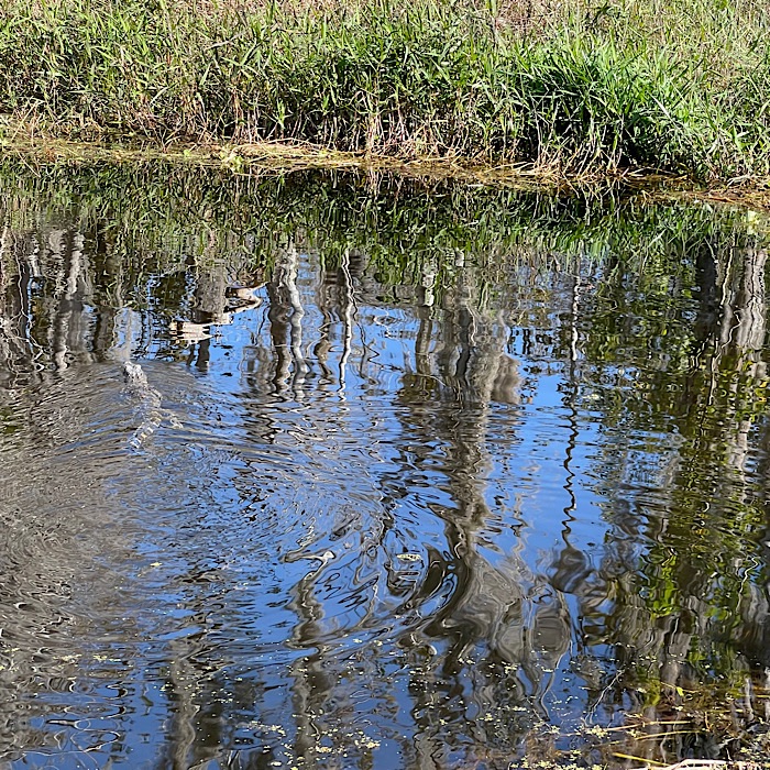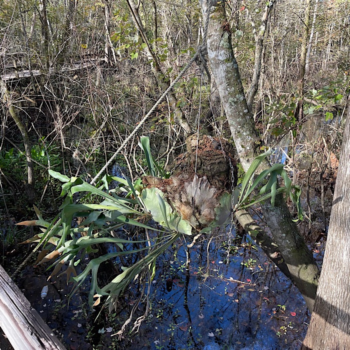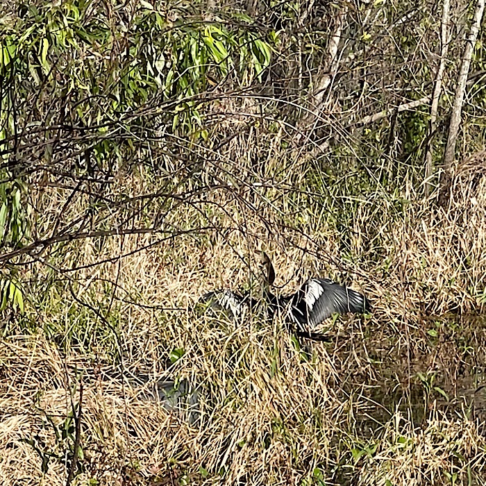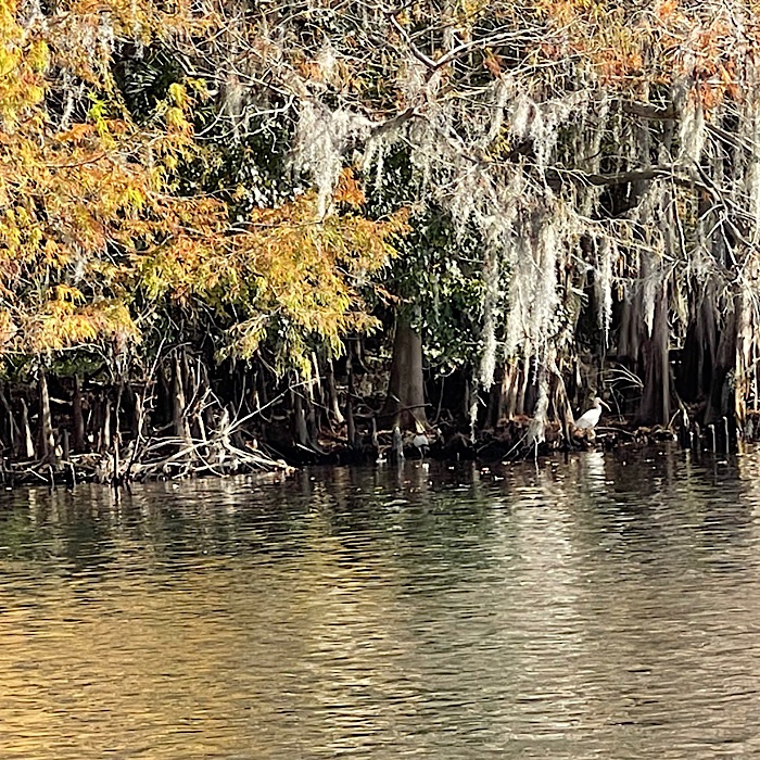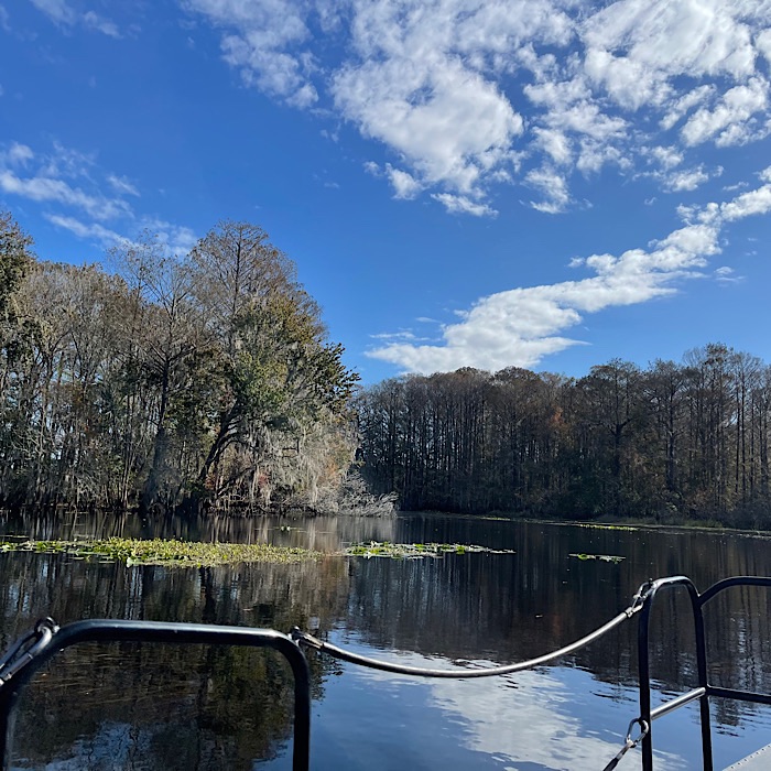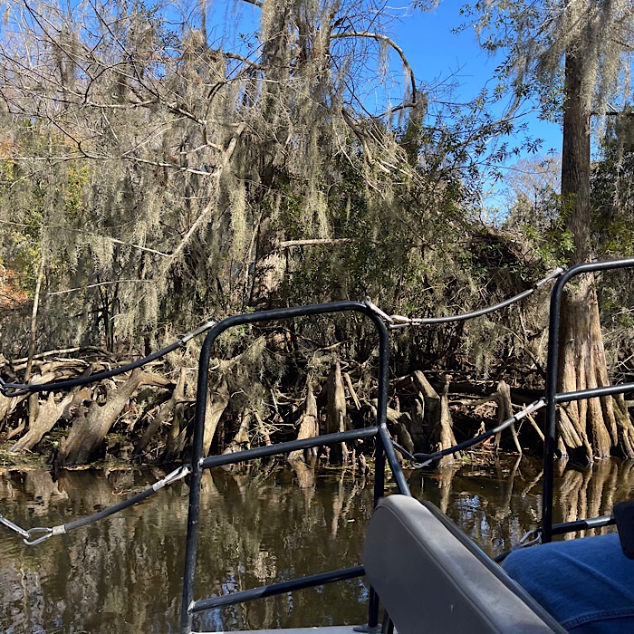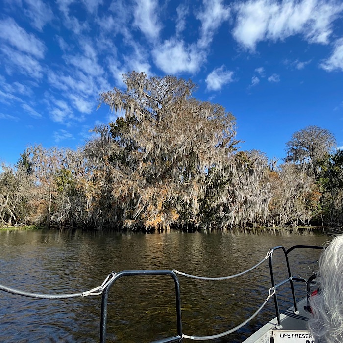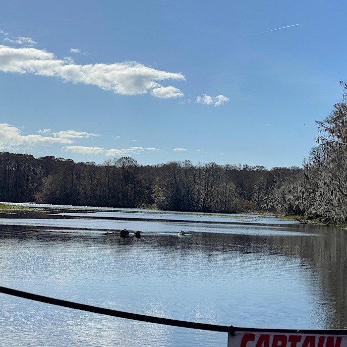 We saw lots of wildlife and visited a gator nesting spot. We saw baby alligators. Bruce got to see the right foot mother alligator hiding in the grass. I didn’t see her, but I did see a six foot long alligator on another part of the river. We went through a tunnel of trees, which the captain called Tarzan’s tunnel. In most places, it was easy to see the bottom of the river.