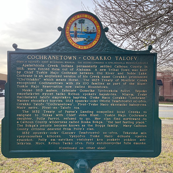 We rode the motorcycle to the Florida Trail Neal Landing Trailhead by the Apalachicola River. The river was high due to all the rain we’ve been having. As we were leaving the landing area, I spotted another historic marker by the maintenance building. Bruce pulled over so I could take a picture over his helmet.