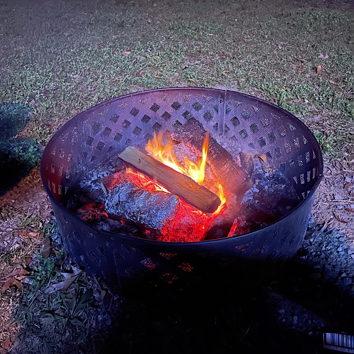 The second campfire, I placed an aluminum foil packet of a sliced onion and red bell pepper with Berber spice mix and a drizzle of olive oil into the campfire coals. I also placed an aluminum foil packet of scrubbed and quartered beets with a drizzle of olive oil into the campfire along the side of the coals. I wanted the beets to slowly roast. I also roasted a red bell pepper on top of the coals.