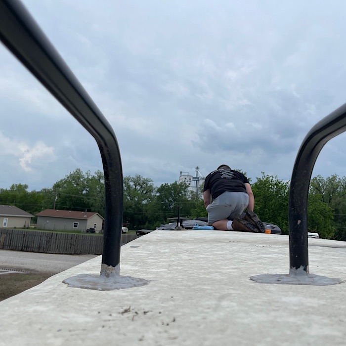 Bruce climbed on top of the RV to see if the roof was okay. All three air conditioners had the covers broken, the two fan covers were shattered, and the sky light was shattered. The slide toppers had holes punched through them. The rear back up camera lost its antenna. The solar controller cover was smashed. The cover for the WiFi antenna was broken. The awning covers are damaged. The metal edging that makes a curve from the roof to the wall is covered with dents.