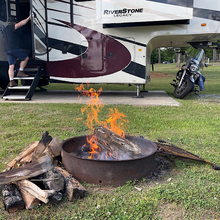 Bruce got the campfire going. We enjoyed watching it while we sat in our camp chairs listening to the sound of the cicadas.