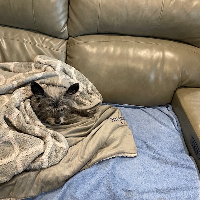 Nox was happy to snuggle down into the blankets I had washed ahead of time.