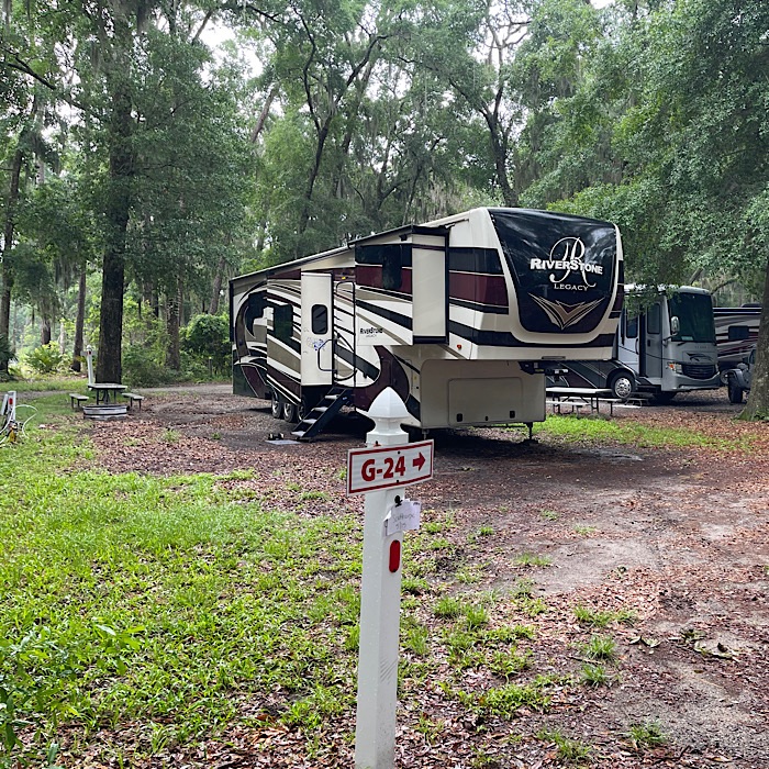 We turned into the campground, stopped at the office for paperwork and headed down the narrow roads under the Spanish moss draped trees to our campsite.