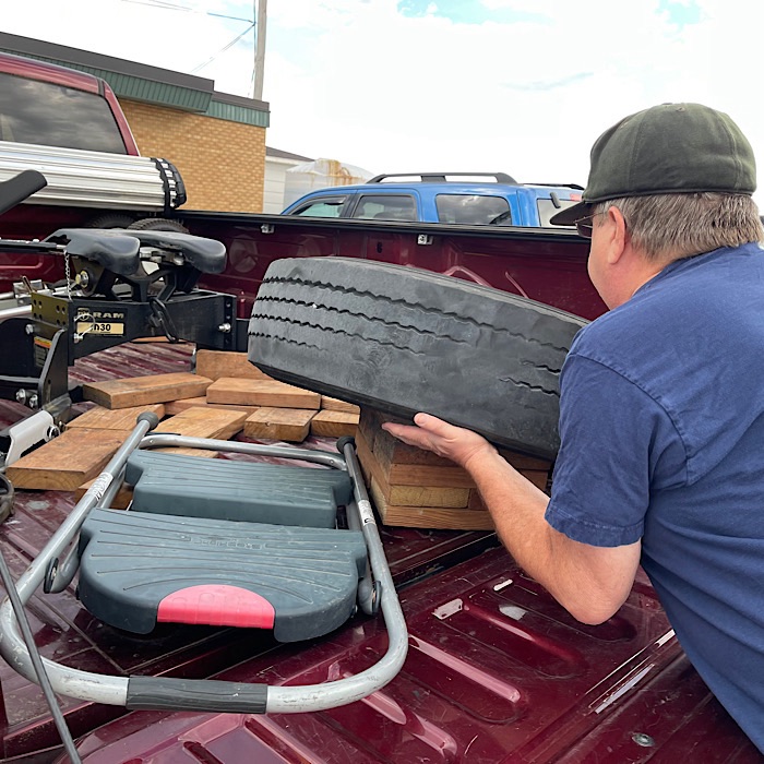 Bruce loaded the tire into the truck bed and drove back to the RV.