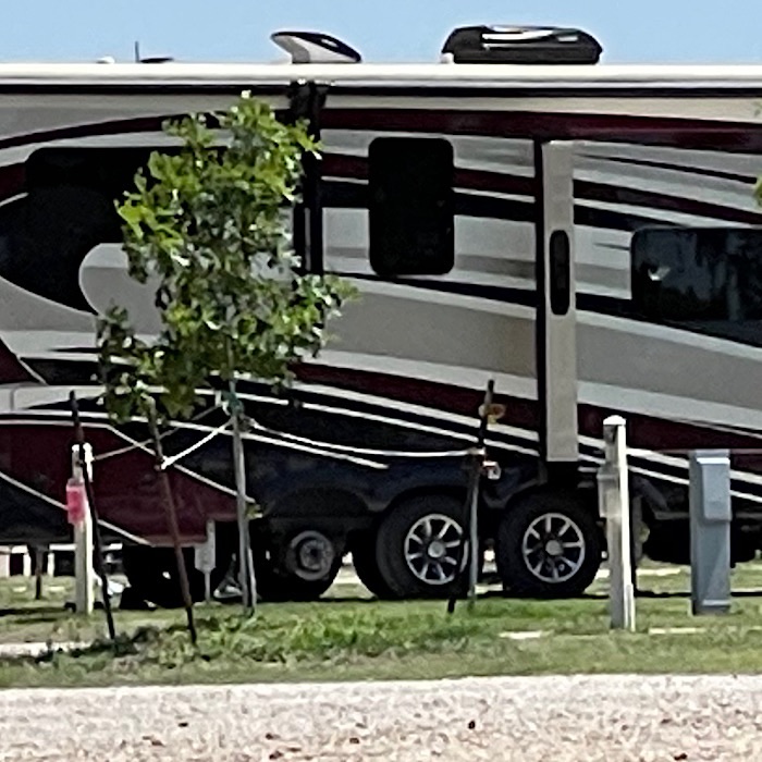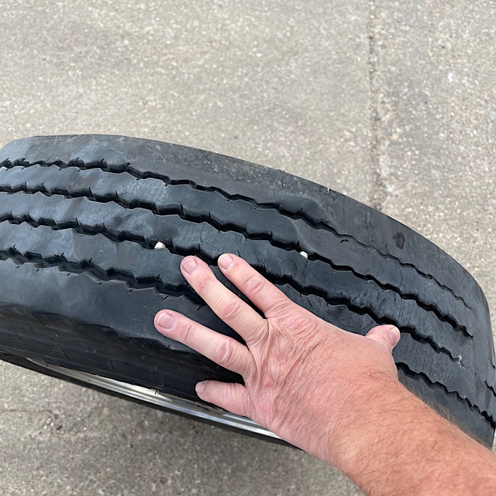 We got up on May 18 and once we got dressed and walked Nox, Bruce removed the rear camping side tire. It was the bouncing tire the man told us about on May 16. At each rest stop, when we checked the tire, it seemed worse.