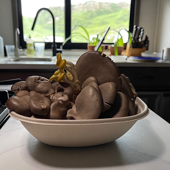 The mushrooms looked like a bouquet. The bowl contained Lion’s Mane mushrooms, Golden Oyster Mushrooms, Oyster Mushrooms, Black Pearl Mushrooms and King Oyster Mushrooms.