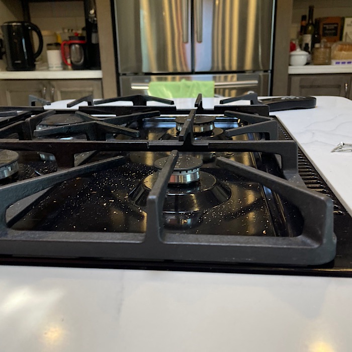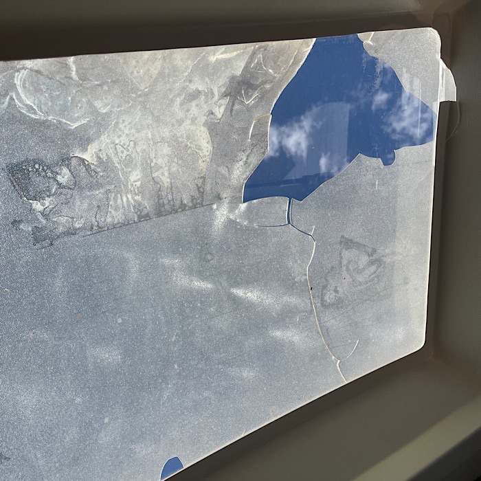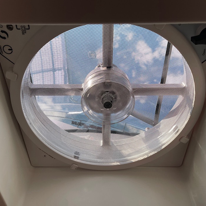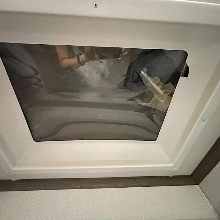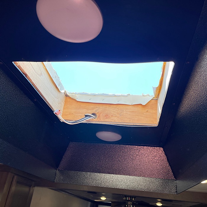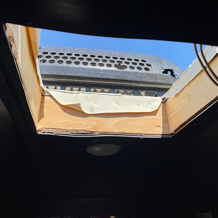 The techs replaced the MaxxAir fans. We couldn’t find just the lids, so the whole units had to be replaced. The new fans’ lids are smoky, which is a lighter color than the original dark lids we had. We’ll get more light in.