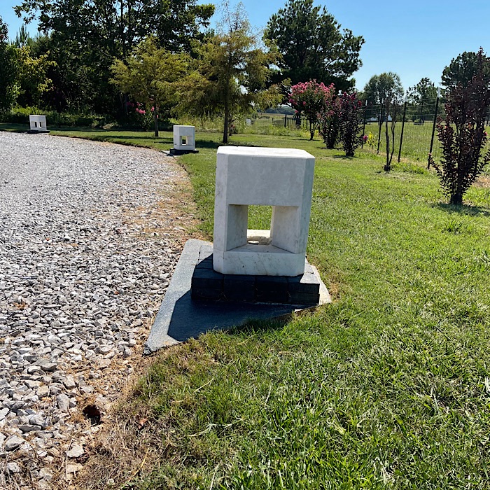 The white marble cuboids with cutouts are light fixtures. They remind me of Japanese lanterns, but they are very modern looking.