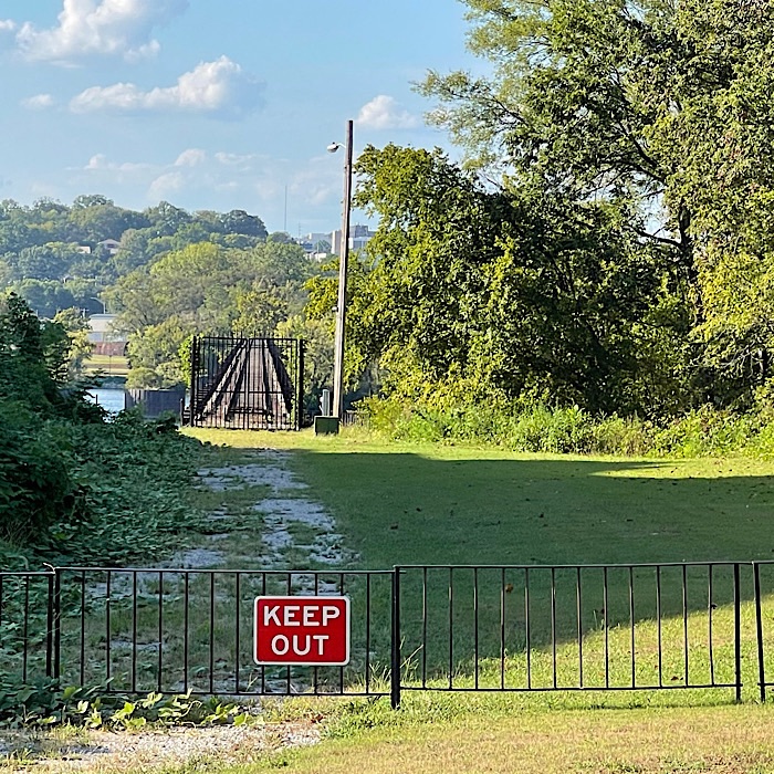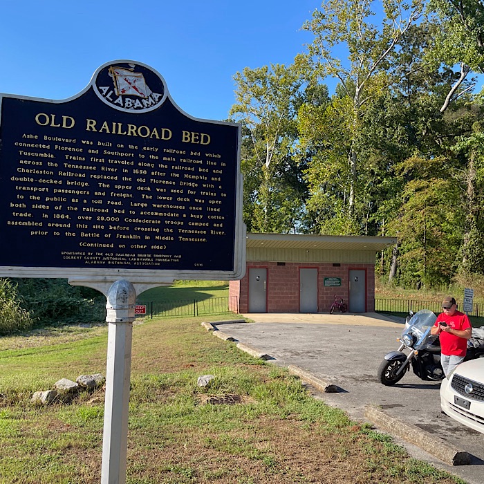 We rode the motorcycle along Hwy 72 to the Tennessee River, turning off into a parking lot that lead to Ashe Blvd. Once we started downhill on Ashe Blvd, we could see the parking lot for the old railway bridge.