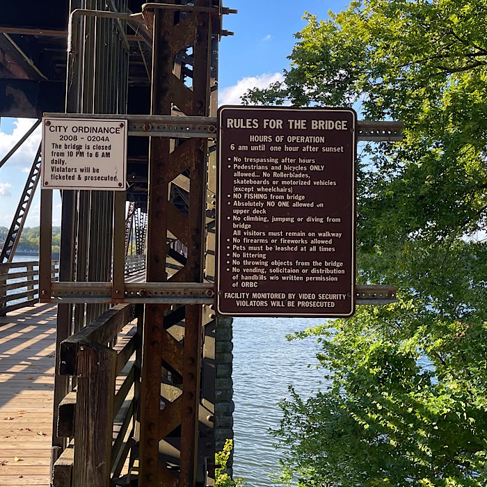 At the beginning of the bridge is a mural, information on the Low Shore Trail and information about the double decker bridge.