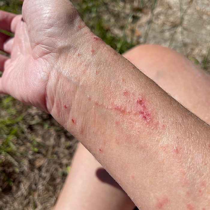 When I first started pulling poison ivy, I was wearing a t-shirt and disposable gloves. The poison ivy managed to get on my right arm.