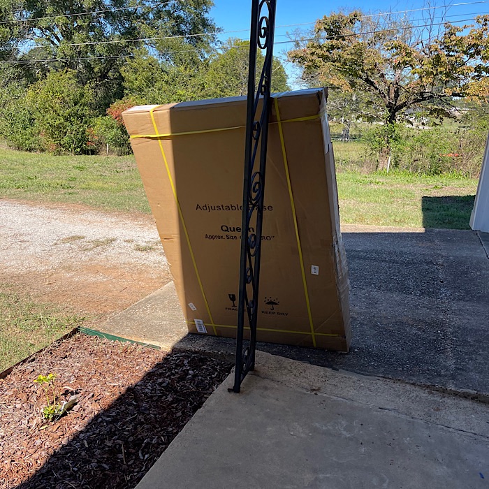 The delivery person left it next to the garage. The box was beat up, so I opened it to see if the bed frame was damaged. It was fine.