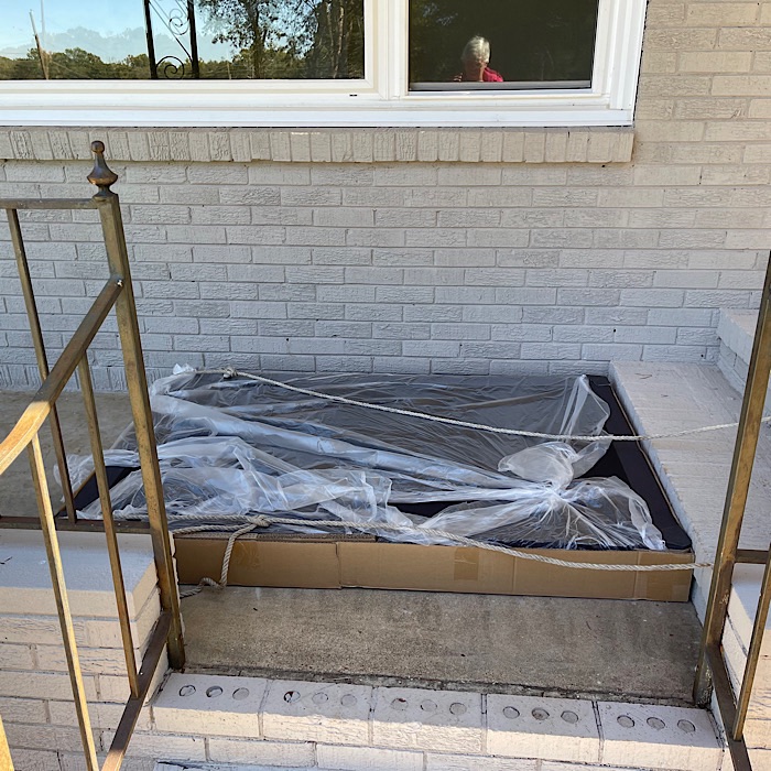 The steps were tricky, I grabbed Bruce’s oversized wrench and used it as a ramp. Once up the steps, I turned the box on its side and wrapped the rope around the box to keep the bed frame in it. I put towels on the floor to prevent any scratches.