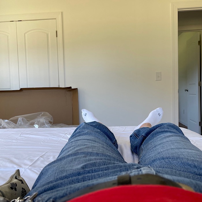 I really wanted to get the box inside and once inside, I thought, you’ve come this far, the towels make it easy to move the box. You can easily get it into the bedroom. Once I got it into the bedroom, I just wanted to see how hard it would be to put together. One thing led to another and I got invested in getting the bed together before Bruce gets home.