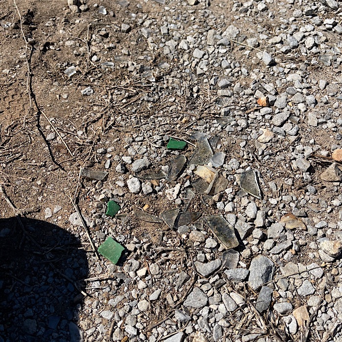 I could see the glass easily with the sun making it glint. I picked up all the glass I saw and then tossed the garbage bag into the trash can. I walked back to Nox and saw a lot more pieces of glass glinting.