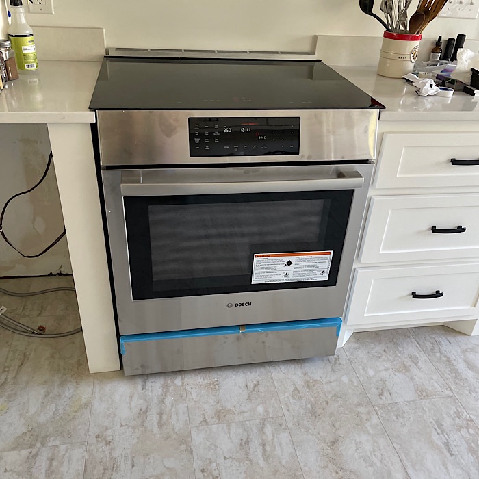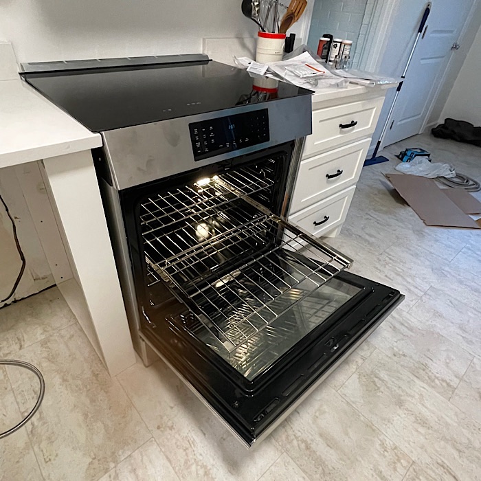 I pulled off the tape from the warming drawer, removed the warning label and texted a picture to Bruce. At his next stop, he called, super excited about the stove.
