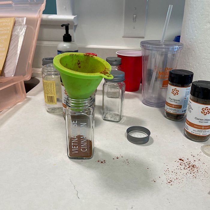 I got out my spice jar kit and started labeling spice jars. I poured spices, herbs and blends into the jars.