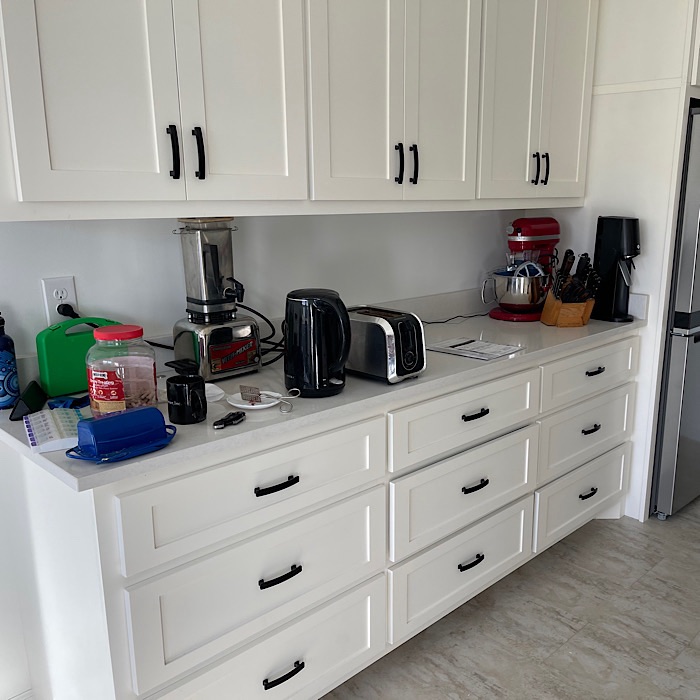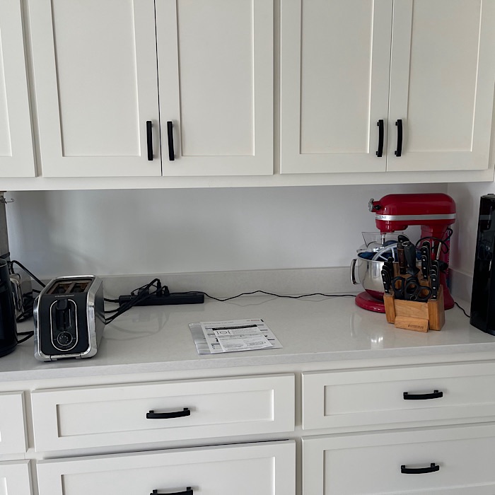 Since I currently have only one wall outlet, I got my flat extension cord for my computer (no longer needed) and plugged it in. I organized my small appliances on the counter top and got them plugged in.
