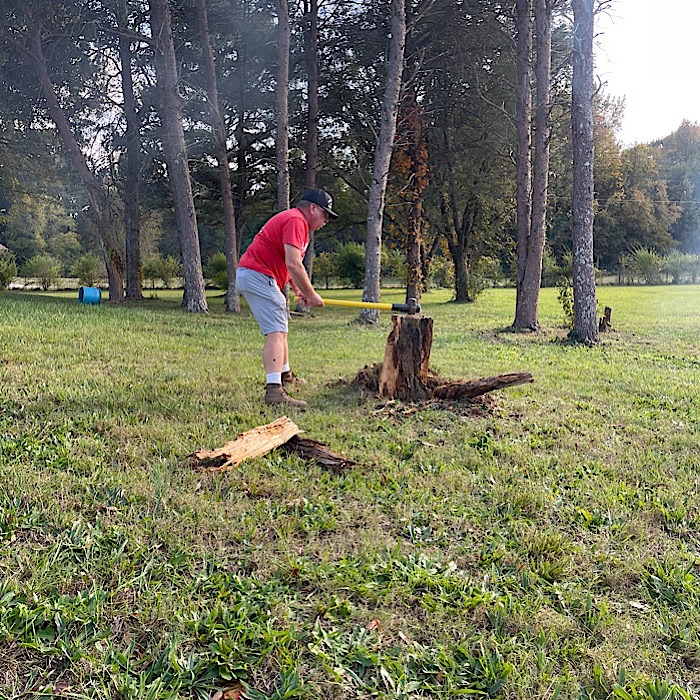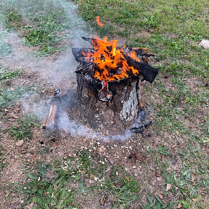 We have several stumps in our yard at various ages. Bruce decided to try the fire method of drilling a hole from the top of the stump, then drilling a hole in the side of the stump to meet the hole from the top. You then put burning twigs into the top hole. The side hole allows for air to feed the fire. It was intriguing to watch.