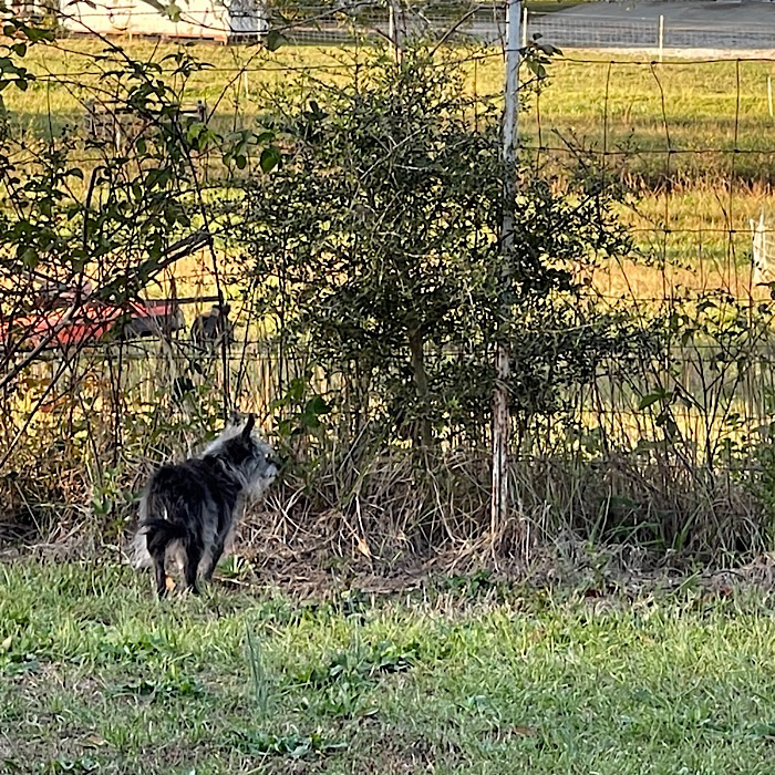 I put down my weeding tool to take the pictures of Nox watching the cows. You can see my weeding tool to the right of Nox.