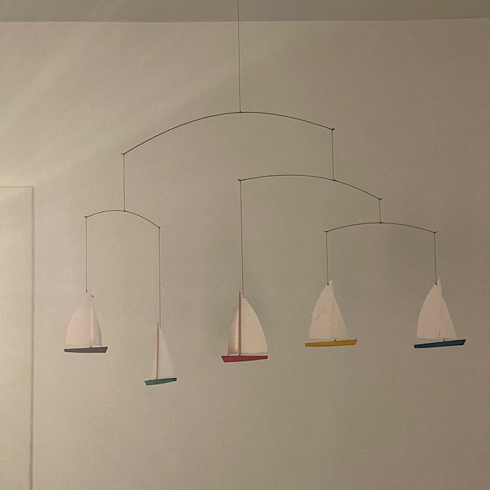 I decided to use a hanging Command Strip to hang up the Danish Flensted Dinghy Regatta 5 mobile in my office/studio.