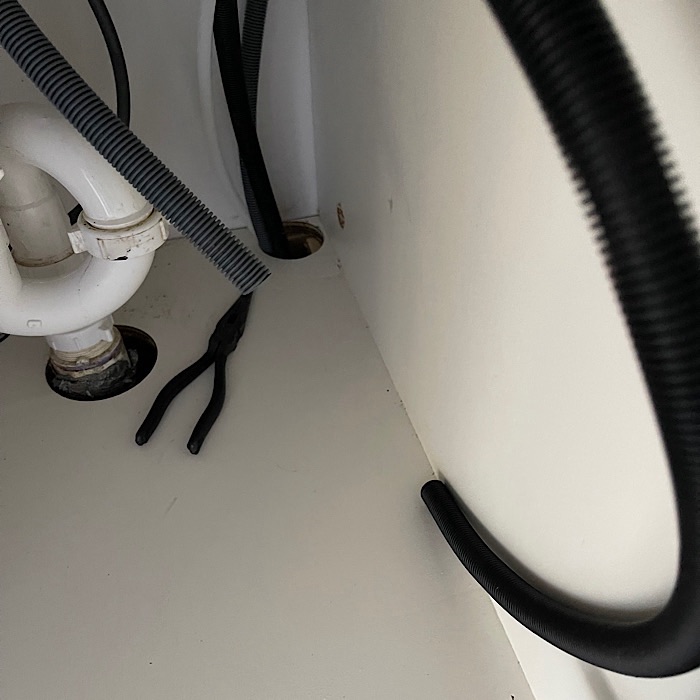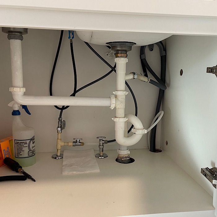 I replaced the straight drainpipe with a drainpipe with a discharge port. Bruce came and admired my work. I had a suggestion as to where we should install the drain hoses holder for the two drain hoses from the dishwasher.