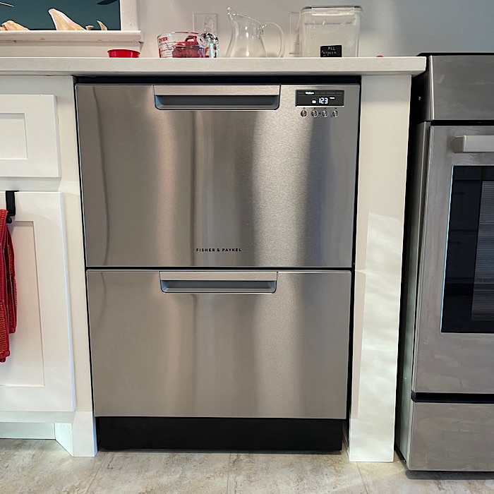 Since we had the cabinet space, we got the two drawer dishwasher. If I had been designing the cabinets, we would’ve got the single large drawer dishwasher and put a drawer below it. The drawer dishwashers are considered very easy to use for people with mobility problems. The drawer by the counter means almost no leaning over to load the dishwasher.
